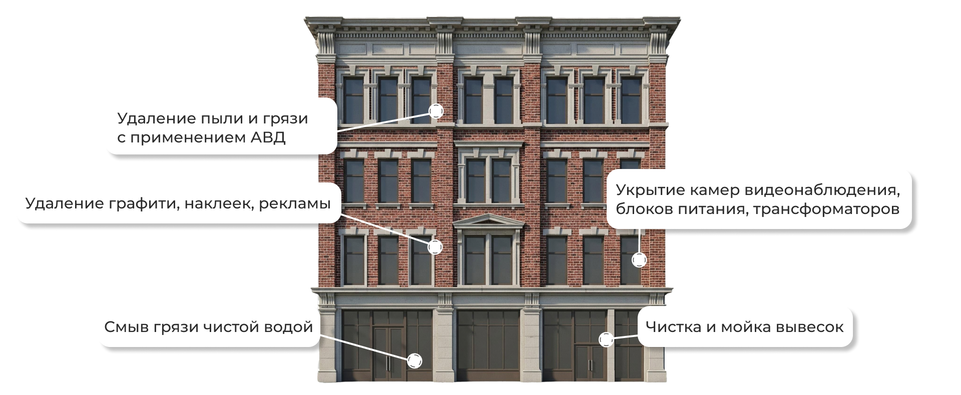 Мытье фасадов от пыли, грязи, сажи с применением АВД и специализированной химии